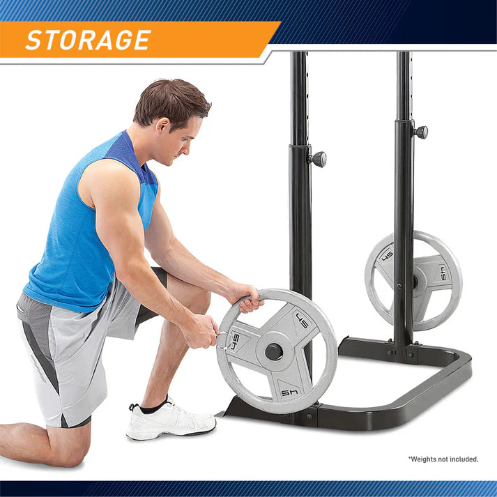• אחסון משקולות מובנה: הסטנד כולל שני פינים לאחסון צלחות משקולות אולימפיות, לשמירה על סדר וארגון בחדר הכושר וליציבות מוגברת של המתקן.